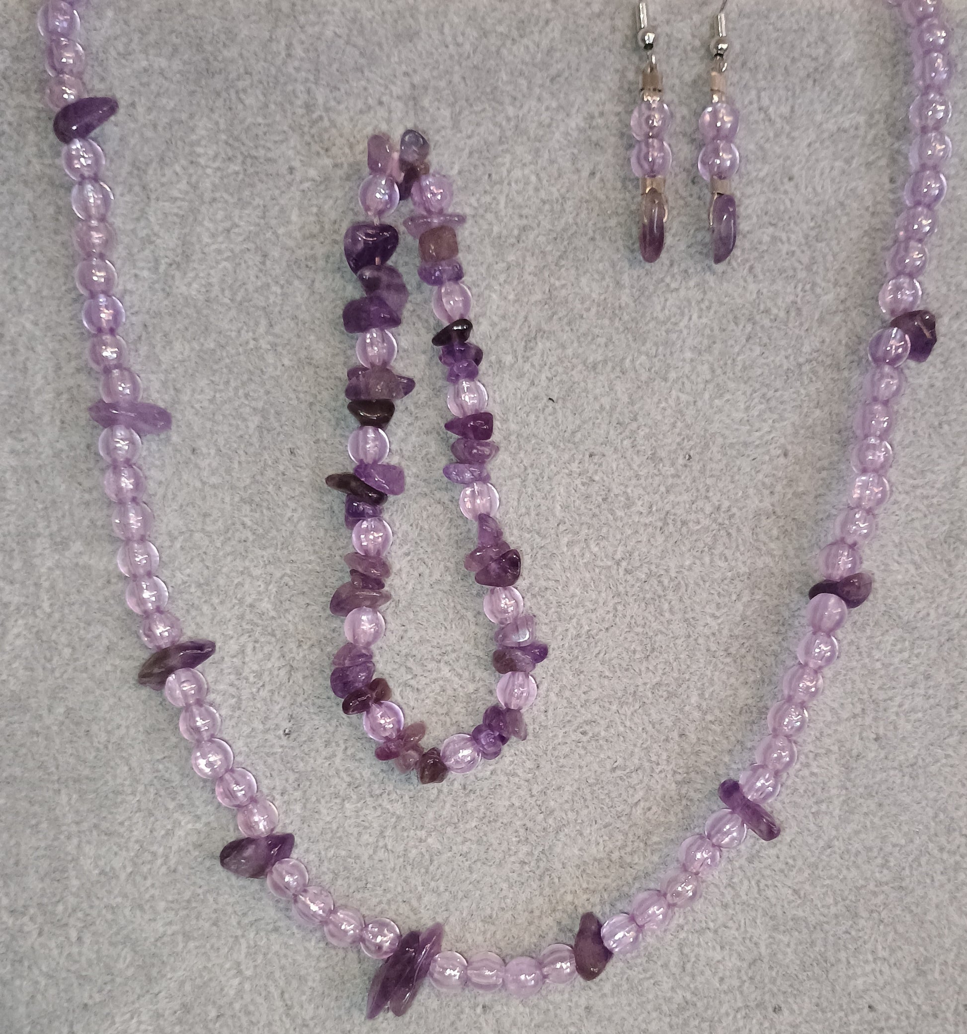 Schmuckset bestehend aus einem Armband, Ohrringen und Halskette. Das Armband ist etwas elastisch und passt zwischen 15 und 18 cm. Die Ohrringe haben die Verschlussart der Afrohaken. Die Halskette hat einen Karabinerverschluss mit Verlängerungskette, die mit einem süßen Herzchenanhänger in silber endet. 100 % Naturstein und dazu passende Perlen.