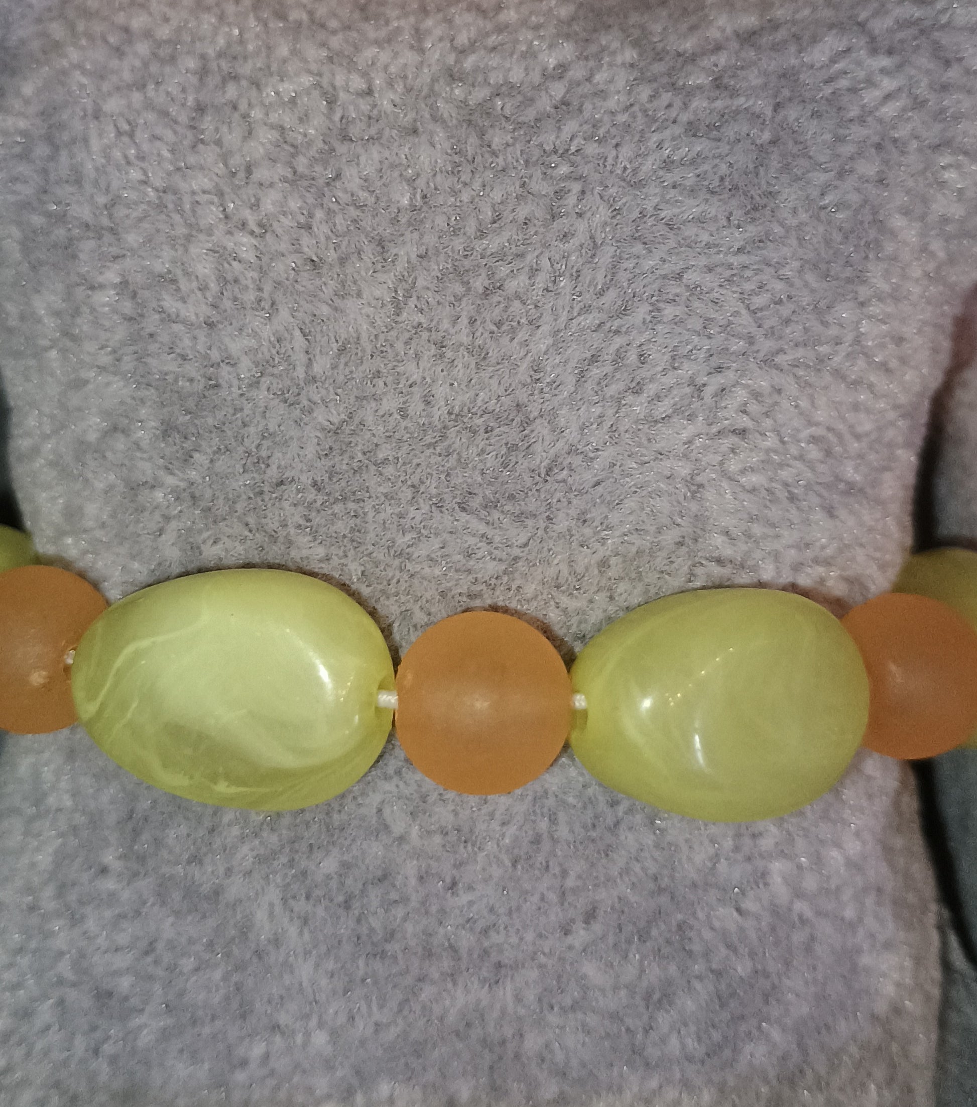 Gelbe Steine mit orangenen Perlen. Elastisch, passt zwischen 16 und 18 cm.