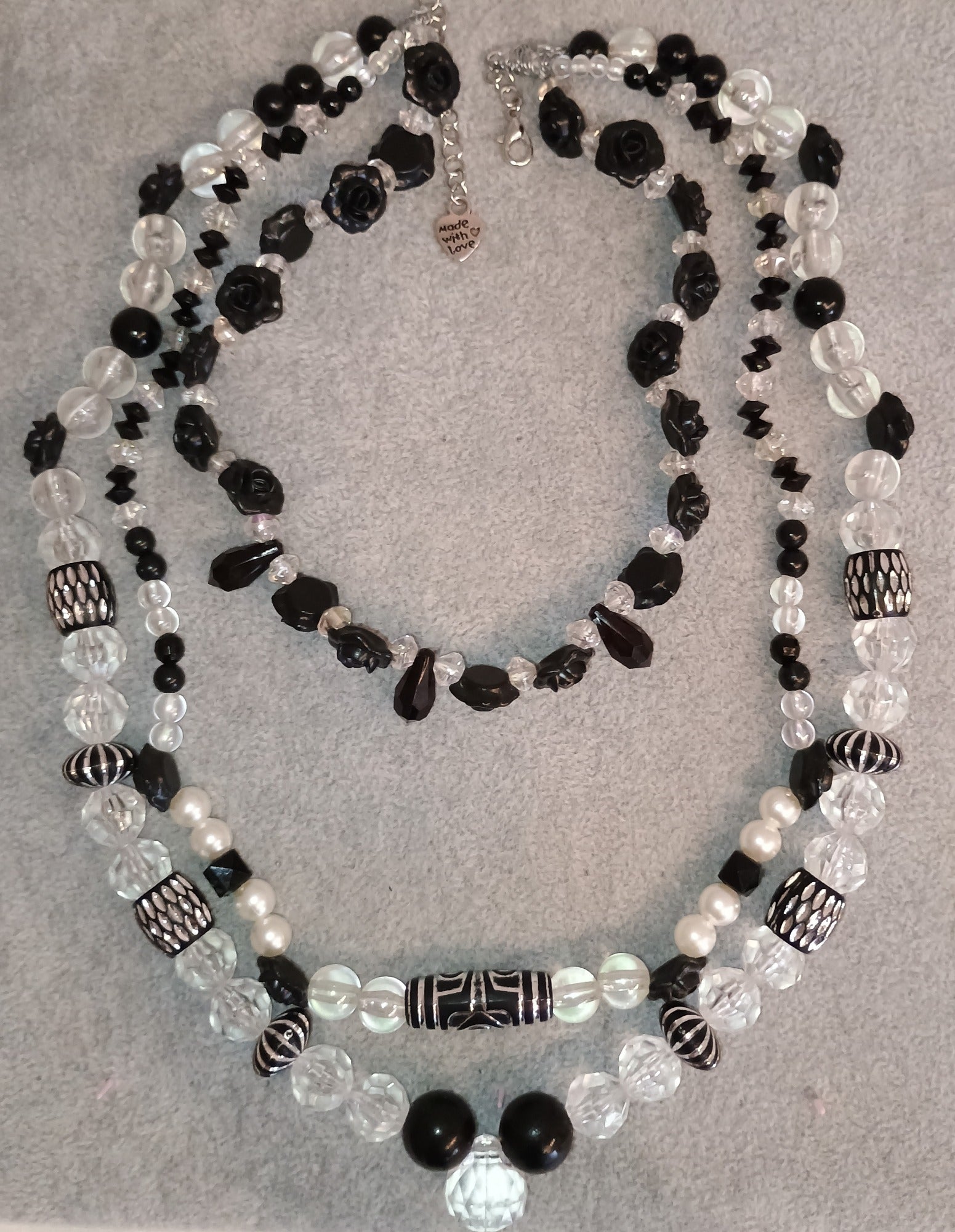 Dreireihige Halskette mit verschiedenen Perlenarten.