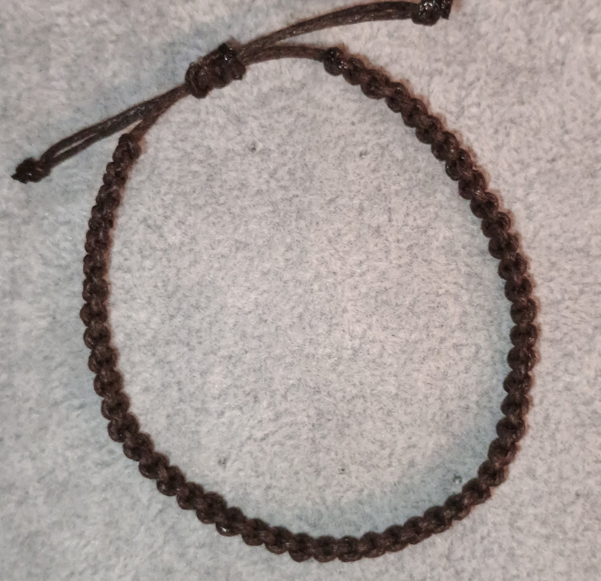 Dunkelbraunes Armband. Lässt sich durch einen Makrameeverschluss zum verschieben in verschiedene Größen einstellen. Ungefähre Größenangabe zwischen 16 und 22 cm