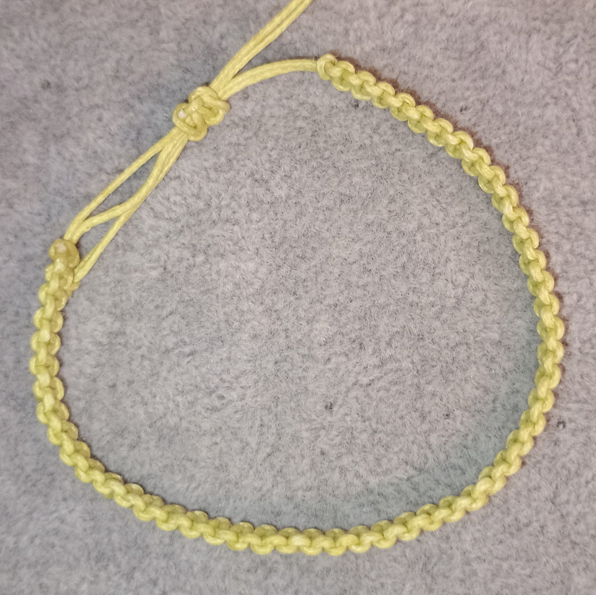 Gelbes Armband. Lässt sich durch einen Makrameeverschluss zum verschieben in verschiedene Größen einstellen. Ungefähre Größenangabe zwischen 16 und 22 cm.