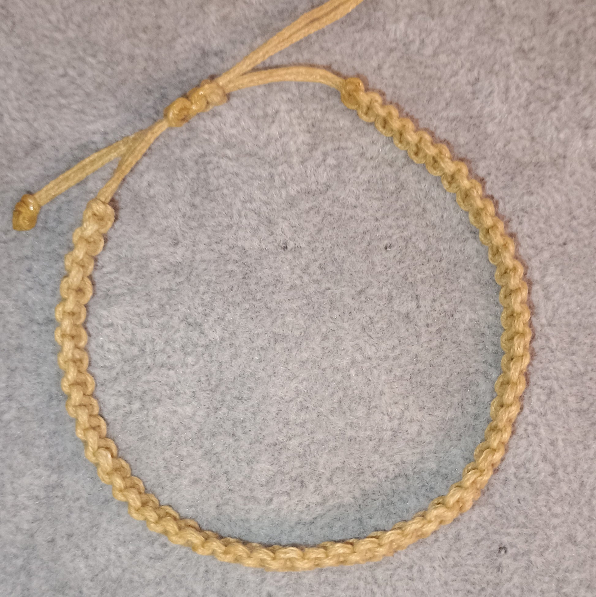 Goldblondes Armband. Lässt sich durch einen Makrameeverschluss zum verschieben in verschiedene Größen einstellen. Ungefähre Größenangabe zwischen 16 und 22 cm.