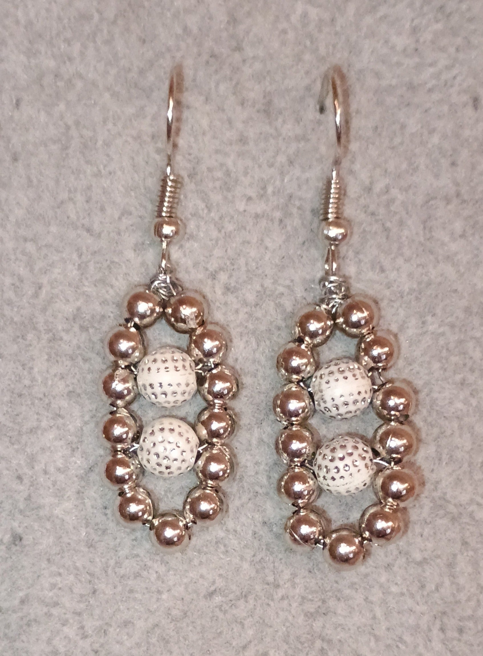Silberne Ohrhänger mit zwei weissen metallischen Perlen als Kontrast zu den silberfarbenen.