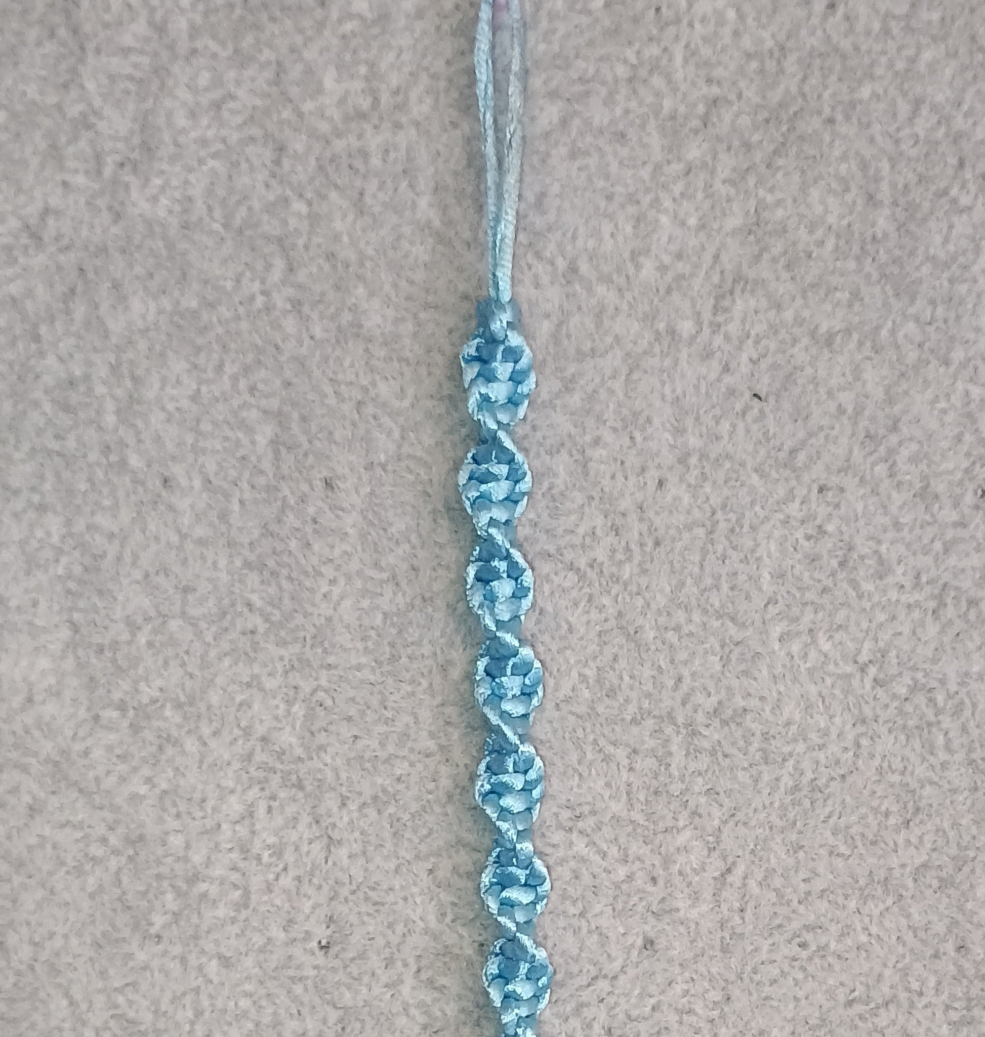 Blaues Armband mit Wellenmuster. Lässt sich durch einen Schlaufenverschluss zum Knoten in verschiedene Größen einstellen. Ungefähre Größenangabe zwischen 16 und 22 cm.