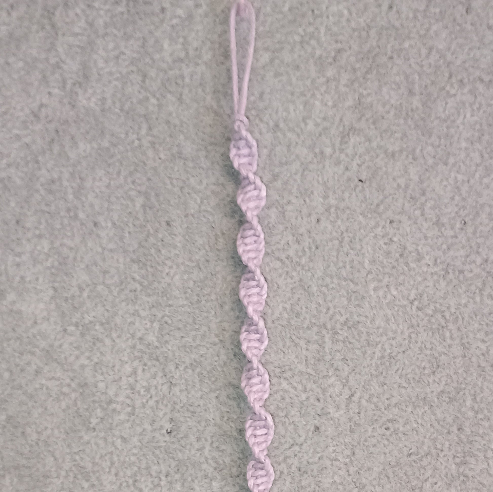 Fliederfarbenes Armband mit Wellenmuster. Lässt sich durch einen Schlaufenverschluss zum Knoten in verschiedene Größen einstellen. Ungefähre Größenangabe zwischen 16 und 22 cm.