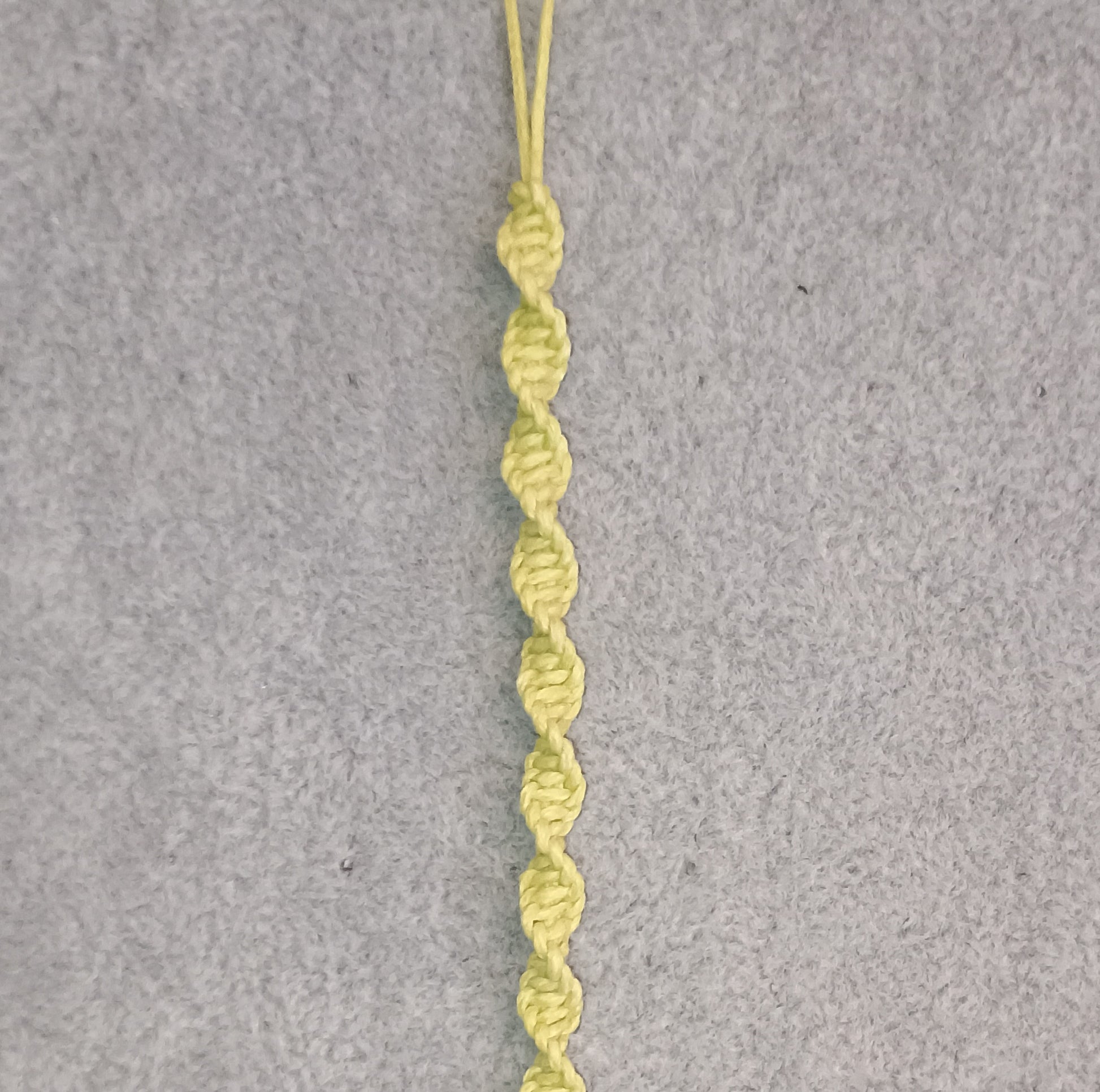 Gelbes Armband mit Wellenmuster. Lässt sich durch einen Schlaufenverschluss zum Knoten in verschiedene Größen einstellen. Ungefähre Größenangabe zwischen 16 und 22 cm.