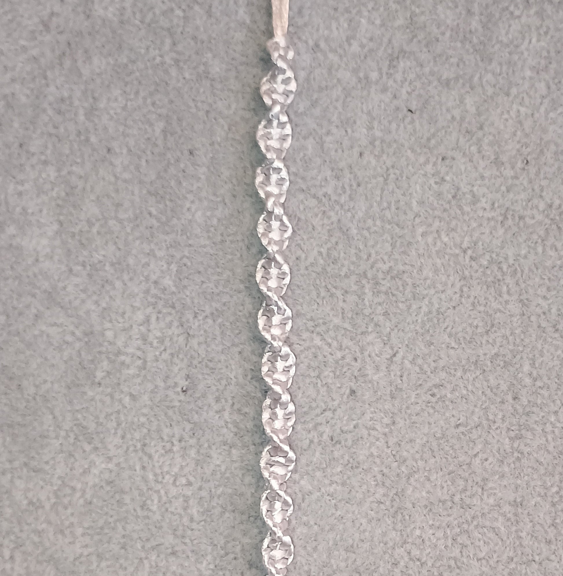 Silbernes Armband mit Wellenmuster. Lässt sich durch einen Schlaufenverschluss zum Knoten in verschiedene Größen einstellen. Ungefähre Größenangabe zwischen 16 und 22 cm.
